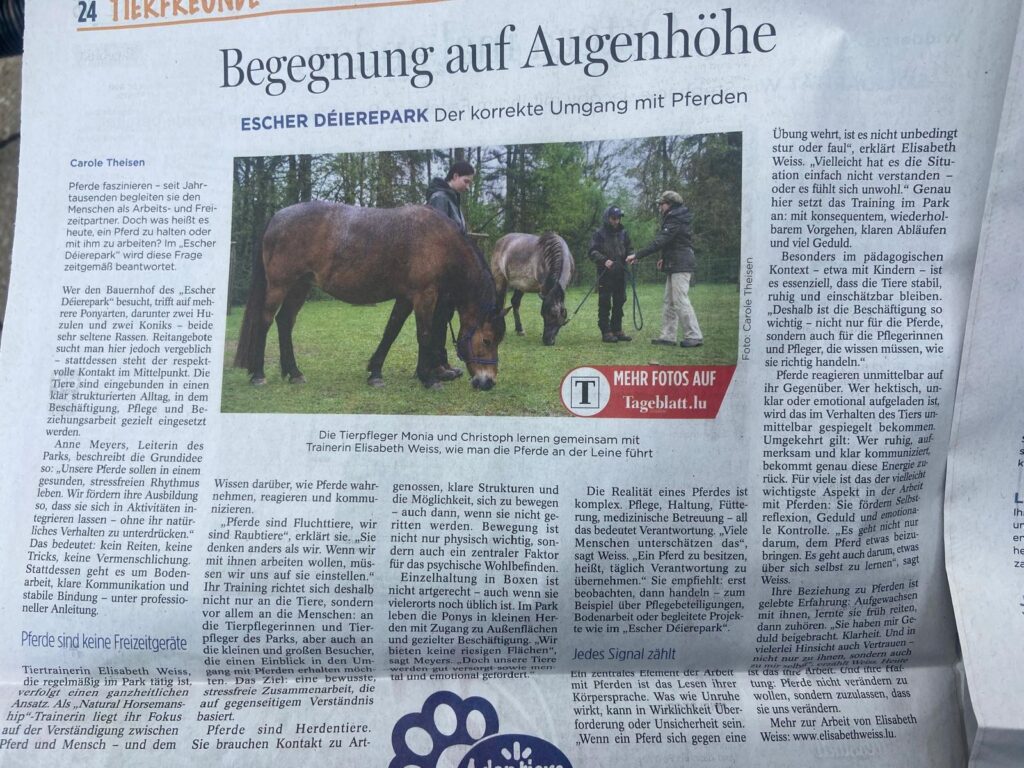 Escher Déierepark Beitrags-Autor:Elisabeth Weiss Beitrag veröffentlicht:19. März 2025 Beitrags-Kategorie:Blog Natural Horsemanship im Escher Déierepark Das könnte dir auch gefallen Colt Start in Italien 22. Februar 2021