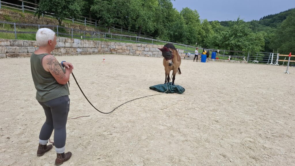 Die 7 Spiele im Parelli Natural Horsemanship wenden wir in diesem Workshop an unterschiedlichen Hindernissen wie Sprünge, Podest, Flatterband usw. an.